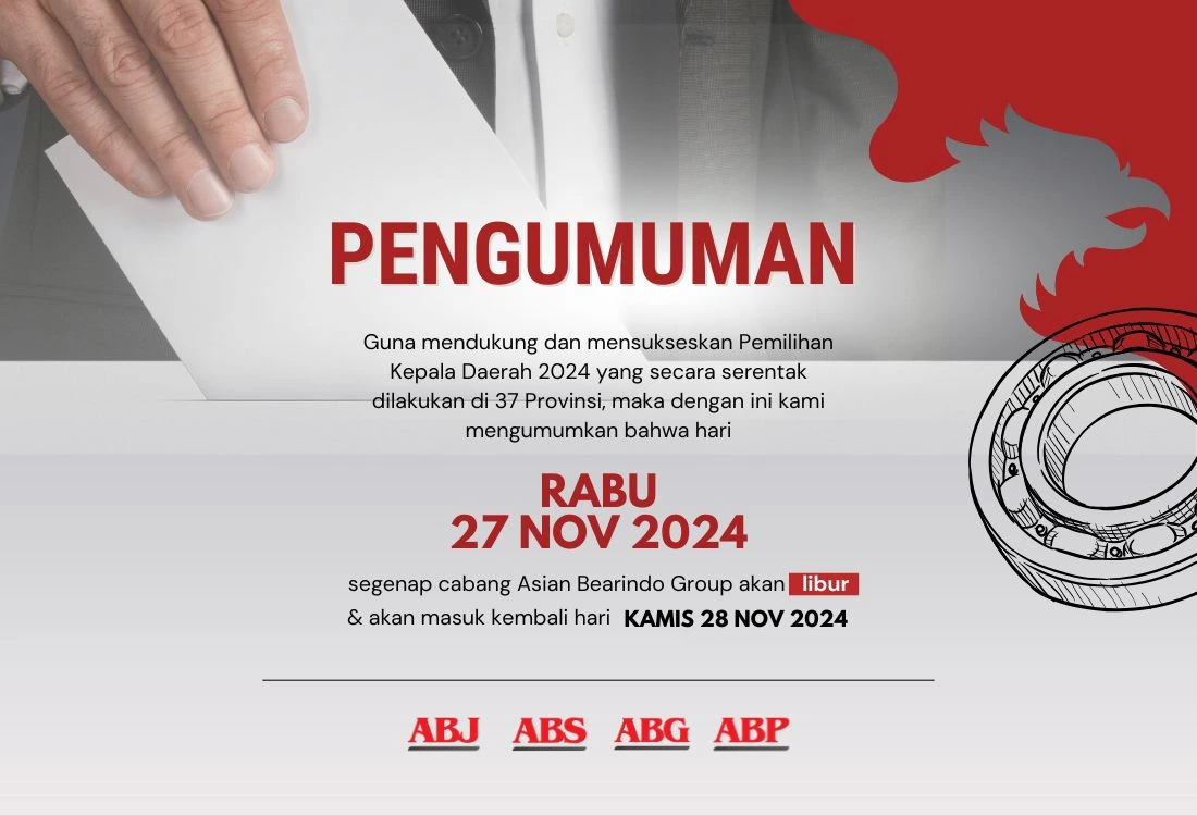 Kami informasikan bahwa seluruh cabang Asian Bearindo Group akan libur pada Rabu, 27 November 2024, bertepatan dengan Pemungutan Suara Pemilihan Umum, Pemilihan Gubernur, Bupati, dan Wali Kota.