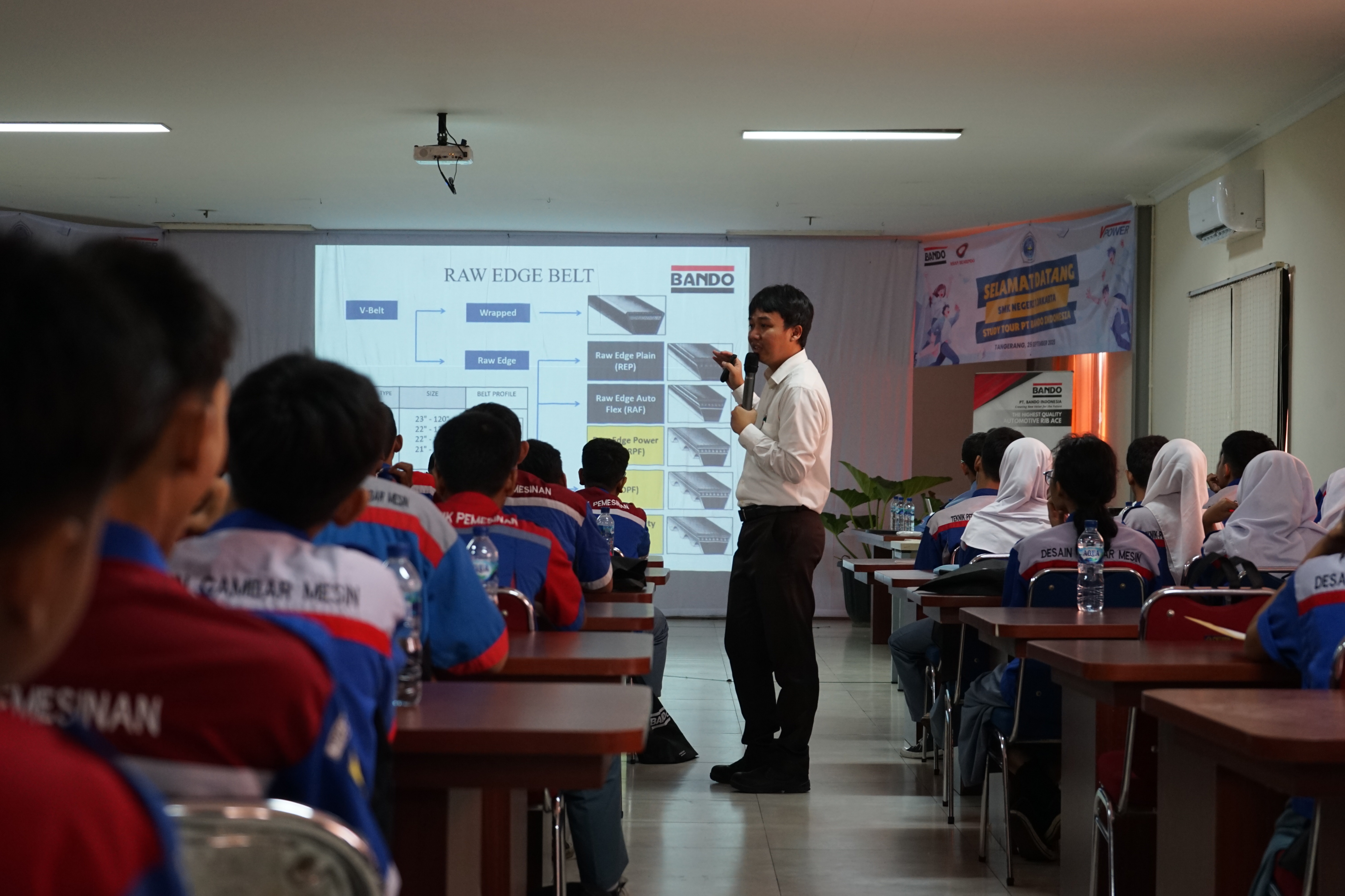 Kunjungan Industri ini juga diisi dengan pemaparan materi dari Bapak Bayu Aji Nugroho selaku Sales Staff dari PT Bando Indonesia yang selama sekitar 1 jam memberikan penjabaran tentang Pengetahuan Dasar mengenai Sabuk Penggerak (V-Belt) dan Aplikasinya.